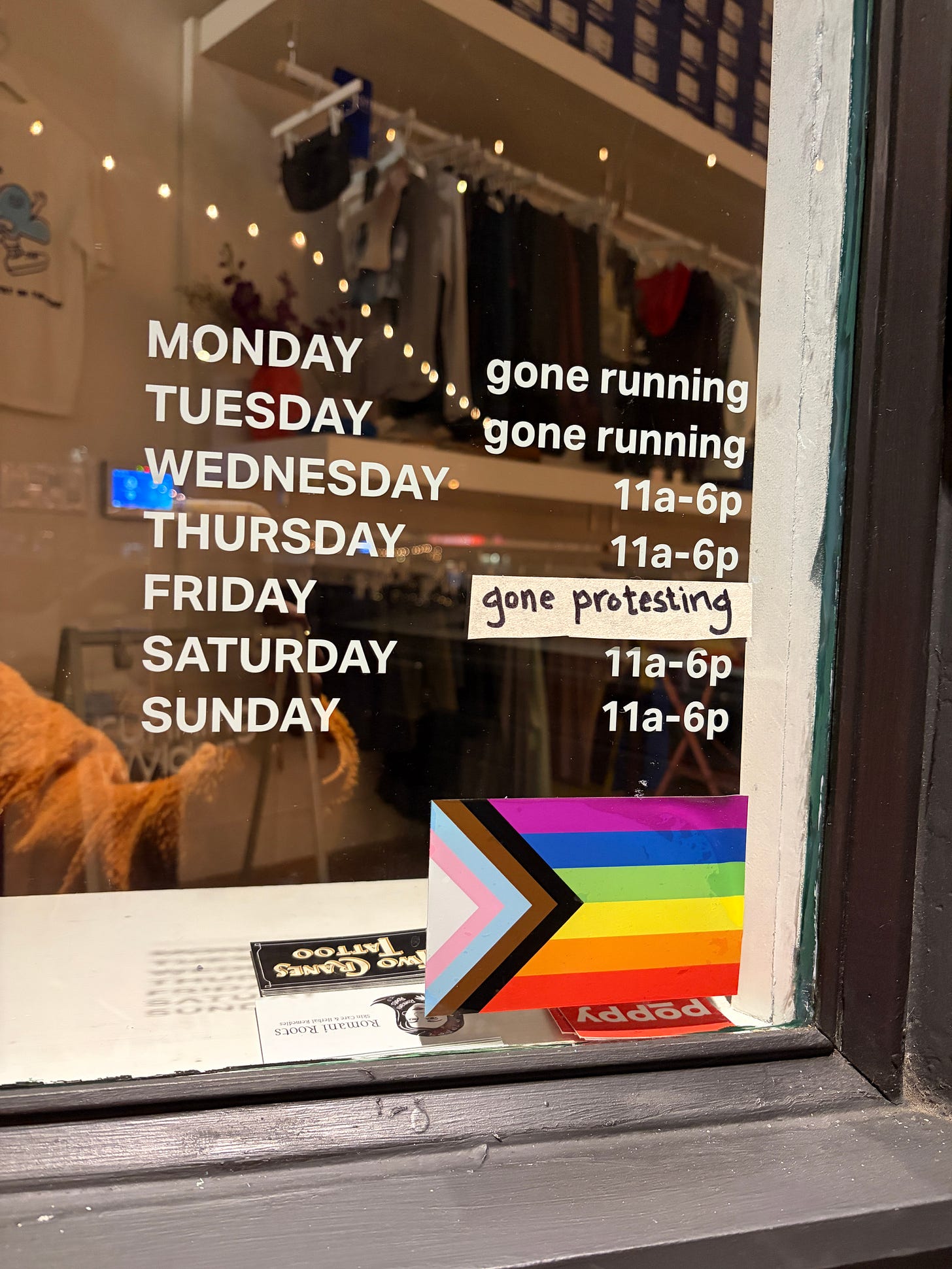I hope if nothing else, the nationwide general strike makes people more aware of where + how they choose to spend their money. If you’re shopping today at a place that’s open while everyone else is closed, ask why. There are plenty of small businesses who are open; but few who haven’t somehow addressed what’s going on. Many are open because they can’t afford to close, others are open because they service the very communities being targeted. The Targets, the Gaps, the Sports Basements of the world aren’t closing but your small independent bookstore is. Your local running store is. These small businesses are closing because they recognize it’s the right thing to do.