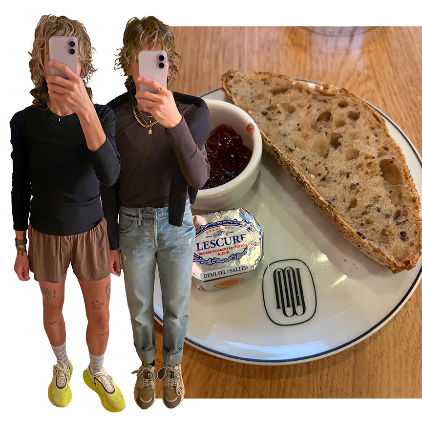 far left : what i wore on my very first run in the morning. i had worn my hikerkind merino LS the day walking around the city the day before. middle : my bandit seamless merino i wore for my day full of meetings which i then wore for my run the following morning. far right : the bread, butter + fig jam i ate every morning - the MVPs of breakfast.